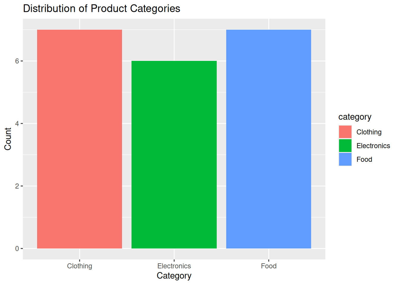 Let’s create a simple bar plot using the ggplot2 library, showcasing the distribution of product categories: