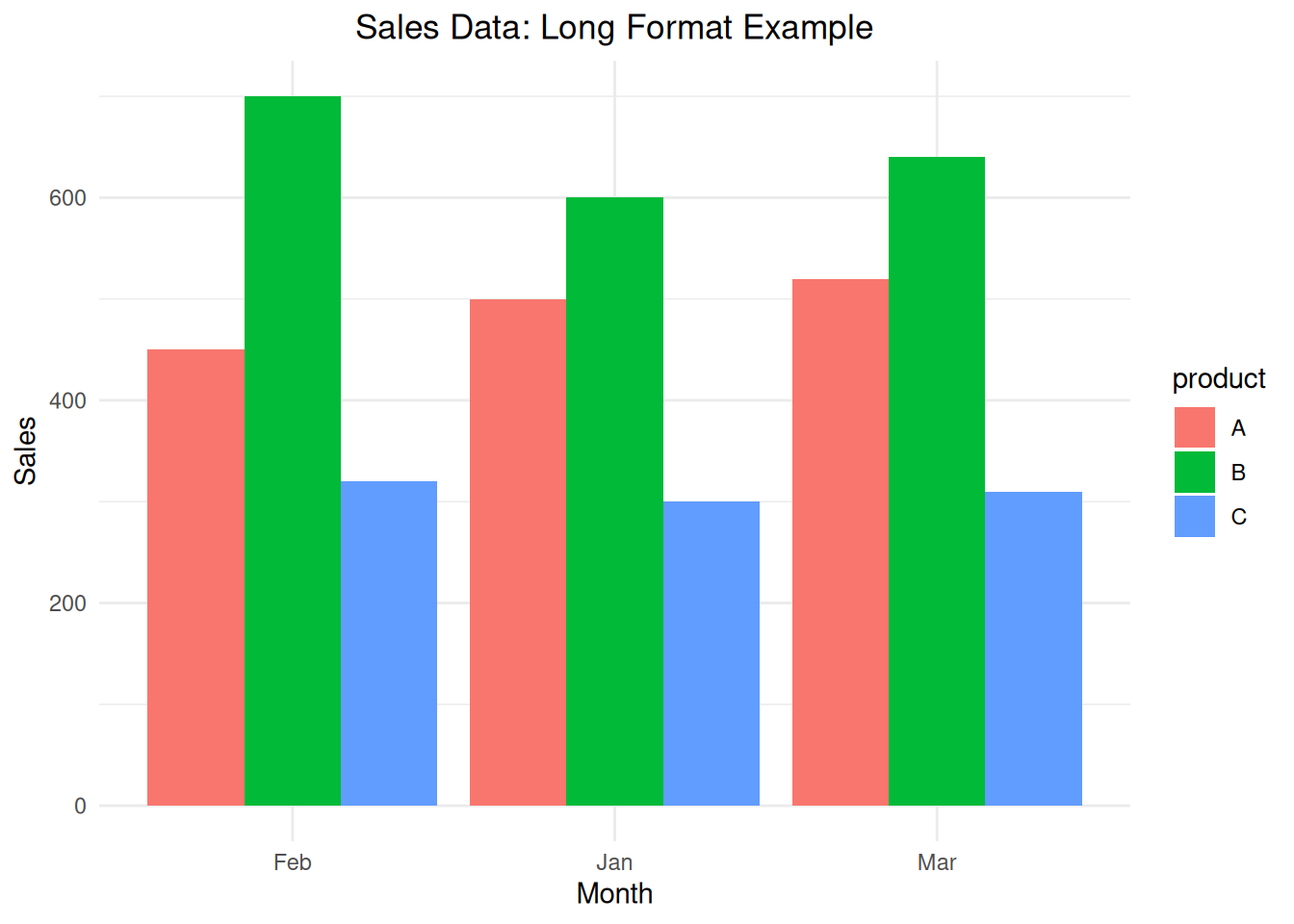 Here’s an example bar plot illustrating the sales data in long format: