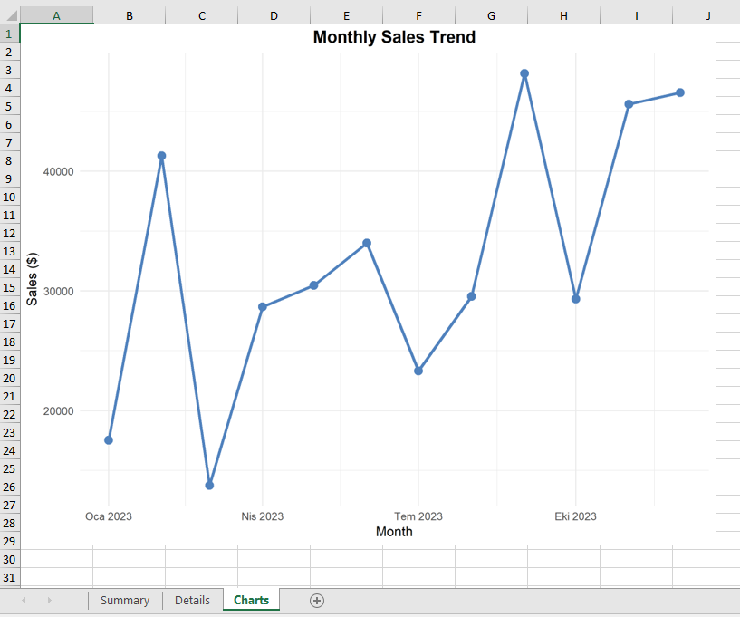 Lastly, the Charts sheet contains a line graph displaying the monthly sales trend. This visualization is useful for spotting sales patterns and seeing how performance changes over the months.