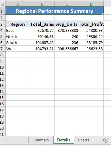 The Details sheet provides a regional breakdown with aggregated sales, average units, and profit for each region. This sheet includes formatted headers and a clear, centered title, making it easy to interpret the regional performance metrics.