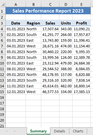 Then let’s create a summary of sales data by region, writes it to the “Details” worksheet in an Excel workbook, and applies styling for a professional presentation.