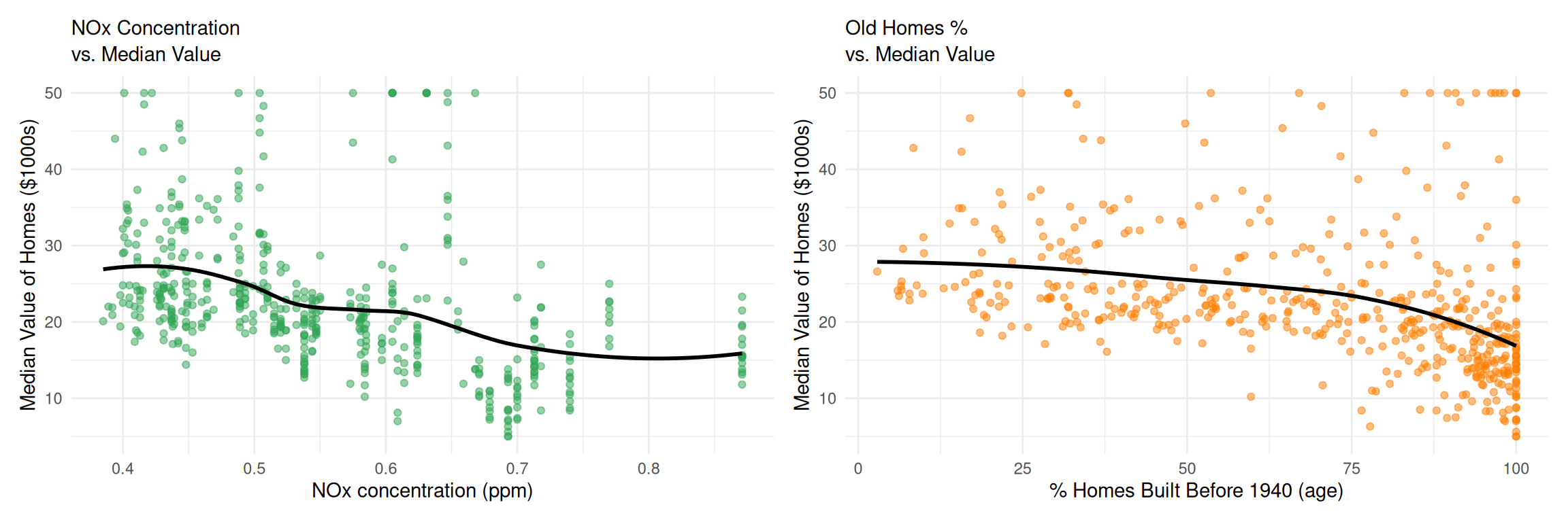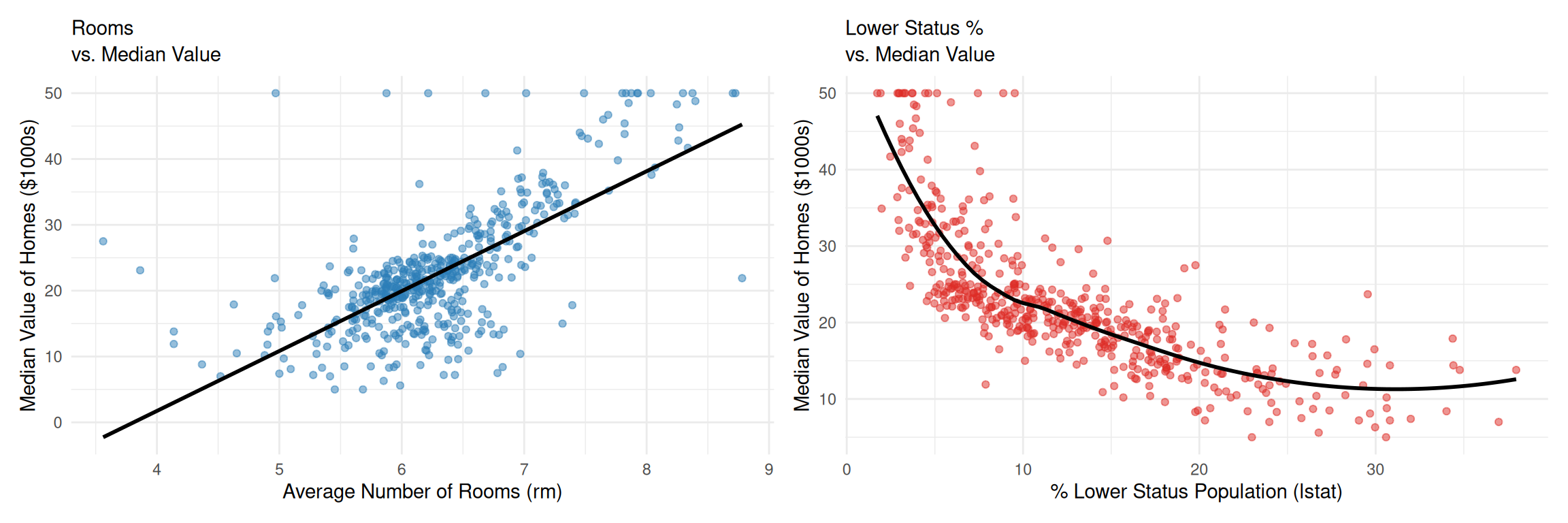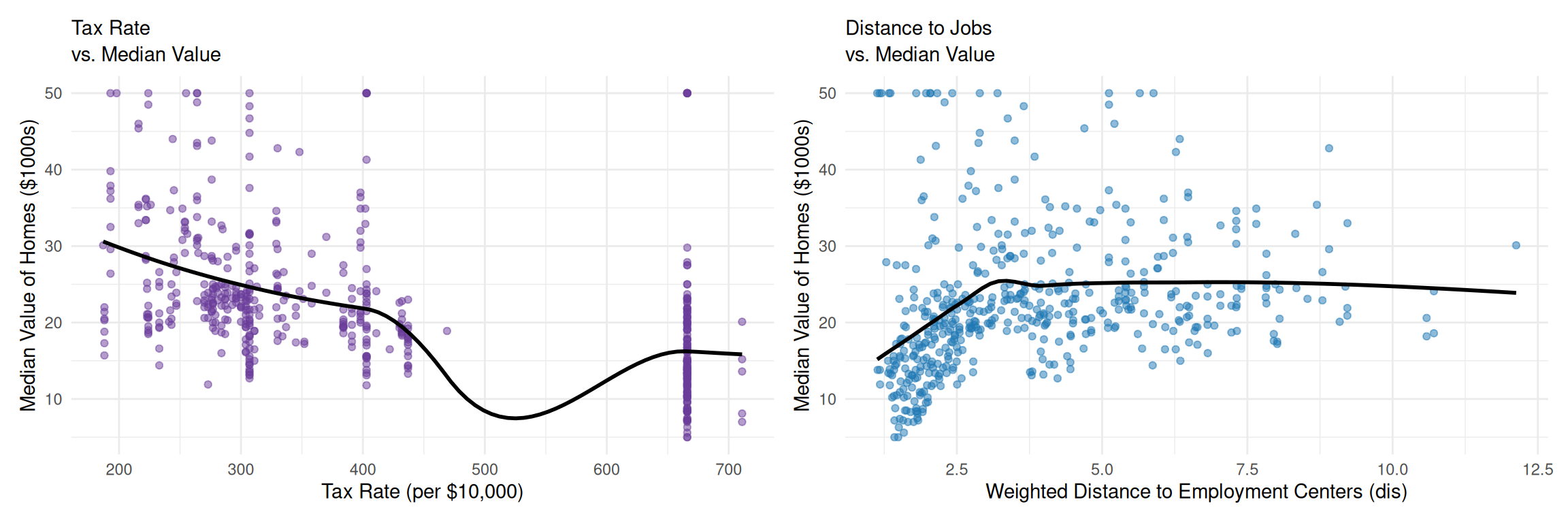 Let’s visualize some of the most influential variables in relation to `medv`, our target variable. These exploratory graphs help reveal potential linear or nonlinear relationships, outliers, or the need for transformation.