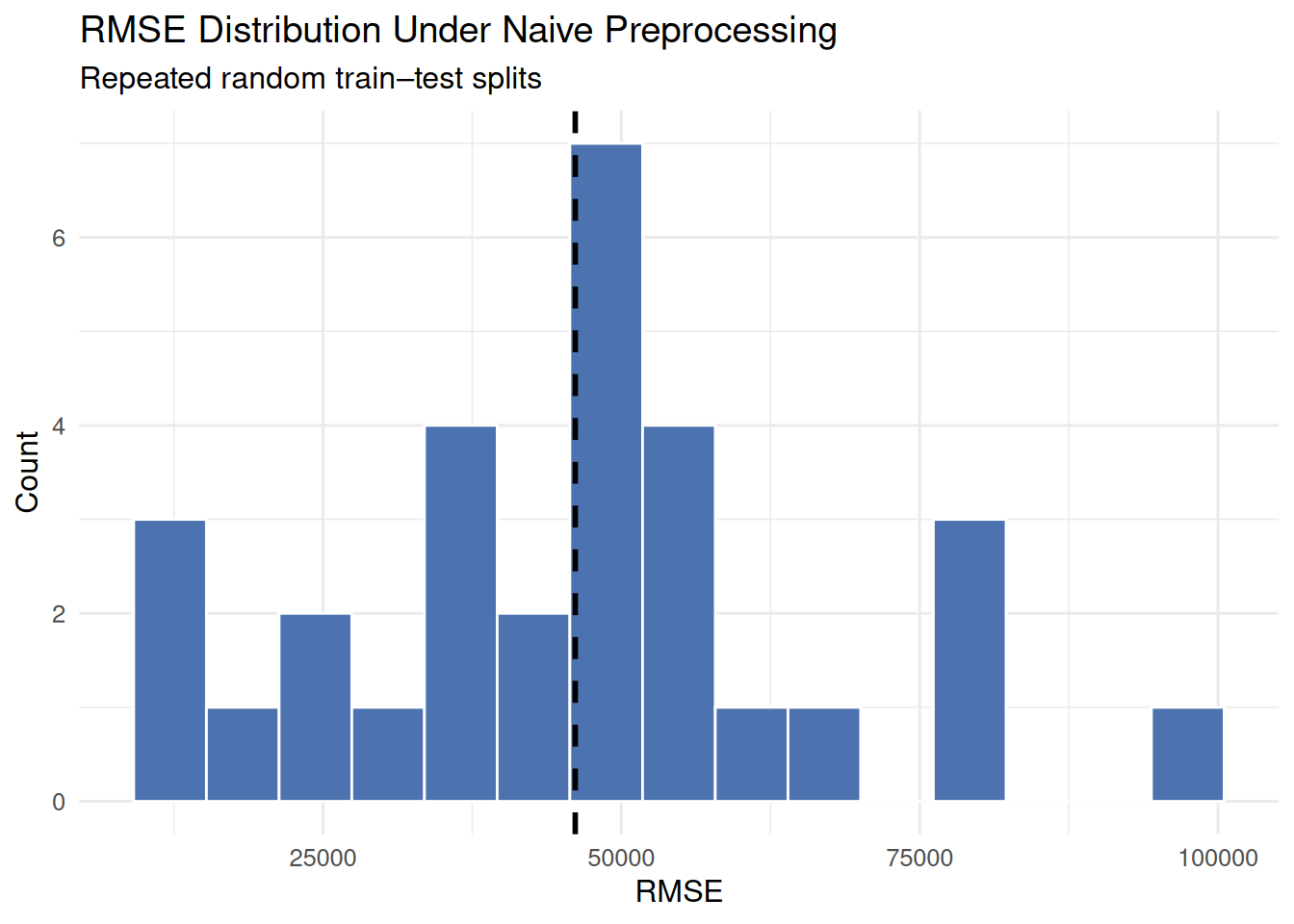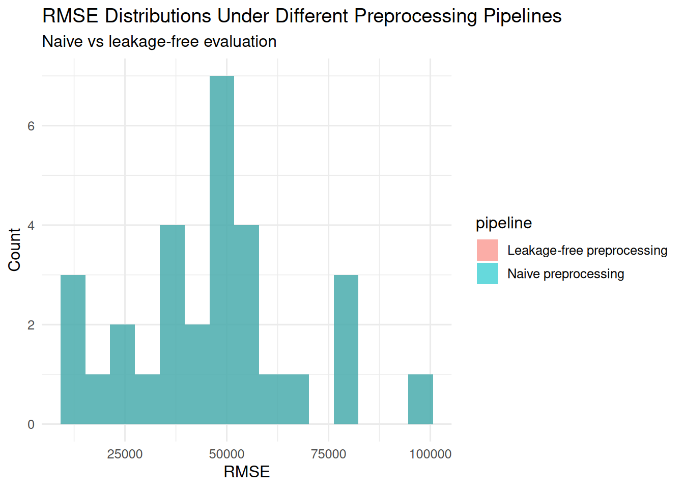 In the following section, we will repeat the same experiment using a leakage-free preprocessing pipeline. By comparing the resulting RMSE distributions, we can assess whether improper preprocessing leads to systematically optimistic or distorted performance estimates.